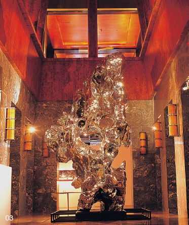 这么一块完整而又漂亮的大石头真是太难找了!我从1995年开始找石头到现在,还没有发现第二块这么好的大石头。你站在它的面前,真的会叹服自然之造化,心里会想:与其一辈子也达不到“如此境界”,不如依照自然,尊重自然,不走弯路!所谓“如此境界”是指我们一辈子可能也学不会的对于疏密有致,凹凸错落,不多不少的那种绝妙分寸感的把握,以及对形体趋势、走向、以及所有曲面弯转的想像力。说白了,这是我们人类预料之外的形体变化。工业板材虽然很有现代的材质美感,但相比之下过于冷漠和简单,让它随着自然形体产生变化,在改变了不锈钢原来的精神特性的同时,也改变了假山石的精神特性。