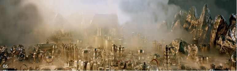 在这次农展馆的“丰收”展中,我用三块山形的不锈钢石头作为城市背景,他们围在展台偏后的位置,很象北京的西山远眺。几千个餐具根据对北京城市的印象摆在台子上,各种锅、碗、壶叠起来时很象一群群的建筑(当然不是所有人都能同意这个想像,可能因为我看建筑太多了的缘故);有些暖瓶整齐的摆在一起很象北京新式小区中的塔楼,虽然几十座连成一片,但每一个长的都一样;有一个圆顶自助餐锅用来当作北京的天文馆;还有一些四条腿带花纹的自助餐锅可以用做表现城市中残留的古建;更多的盘子、碗、碟让人联想到有些混乱的北京城建设,胡同、矮房、拆到一半的房子;刀叉、筷子和勺则用来代表汽车、道路、铁道;甚至工厂、商厦、路面、街道都在这些餐具模拟中有所体现。这些餐具“建筑”与不锈钢山石共同构成了一个极端物质化的都市景观。这些“都市建筑”的样式也是世界上绝无仅有的,虽然怪诞但又是那么似曾相识。一开始标题用的是“山水大餐”,因为这座城市是建构在一个巨大的餐桌上的,有吃的意思在里面,隐喻“山水”是可以被用来吃的。开幕式上我用了两种烟雾;一种是贴在地面滚动,酷似云海的冷烟——干冰;还有一种是烧油产生出的浮在空中的热烟,当它们在空中相遇的时候,形成了一个短暂的停留,酷似古画中的云雾,那些模仿庙宇楼阁的餐具建筑时隐时现。这个景象对应了中国人内心向往的天国,那里永远是烟雾缭绕,好象神仙居住的地方,不同的是当你定睛细看时,又会因为那些可以辨认的餐具而有一种如梦清醒的感觉,甚至不知所以,就象我自己也时常处在对现代都市的惊喜与失去田园生活的失落这两者之间的矛盾当中。