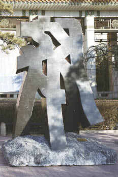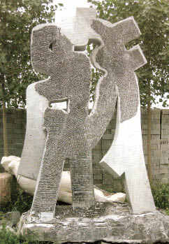 由此,我看到刘永刚在中国美术馆展出的以“爱拥”为题的102件石材雕塑组成的宏大装置时,涌入我脑海中的第一印象,竟然是秦汉时的大型兵马俑场面,他的这些站立的文字就获得了一种森然默立的无声的尊严。“纪念碑性”(monumentality)可以定义为“纪念的状态和内涵”,它不仅要求有巨大的、持久的、艺术中的超常尺寸的含义,也指在历史中那些显著的、重要的、持续的价值。而刘永刚所要表现的,正是他对于人类永恒的爱与关怀的尊崇,在这一意义上,刘永刚以曾经具有广泛流通性,为民众熟悉的文字形式,打通了民族与国界的局限,以冰冷的岩石,表达了火热的激情,在独特的空间形式构造中,将材料与精神结为一体。在中国传统艺术中,纪念碑与文字书法,曾经是一种密不可分的结合形态,但文字仍然从属于内容的表述,书法与雕刻也仅限于作为一种艺术媒介的表达,刘永刚的独特之处在于,他打破传统的字碑组合,使之成为字碑一体,字即是碑,碑即是字,而当我们进入刘永刚的文字艺术装置空间中,又全然忘却了哪里是字,哪里是碑,字与碑在人的基础上已经融为一体,成为人类生命与精神的象征。