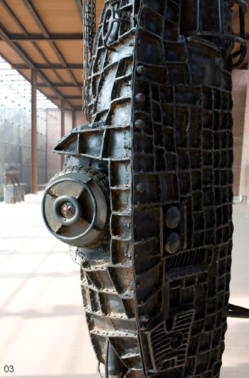 这里所说的“尊重材料”,受到王林先生1996年在成都所做的雕塑展览“敬畏生命”的启发。在我看来,“尊重材料”应该是雕塑艺术家“尊重自然”的一个基本艺术态度。围绕我们生活的所有材料,无论是自然界的原始材料还是人类加工生产出来的材料,都是有生命的,即它们有自身的生成与转换的自然周期,同时它们也负载了人类生命与材料的互动,成为生命价值和意义的载体。从金属雕塑的角度,面对人类对于物质材料的生产和艺术性的结构重组,我更注意后者的创造性的结构关系。金属雕塑与工业材料加工的区别,在于艺术家通过对不同物质材料的造型重组,使之呈现出非功利性的人文意义。在古德语中,“物”这个词意味着聚集和统一,特别是对于考虑言说中的事情,一种争议的聚焦。对于金属雕塑家来说,具有挑战性的问题不只是材料加工的技术,而且是材料选择与重组的视野,即对于材料的选择,就是人对材料的意义的基本把握,是重新敞开人对于材料的关系,回到事物本身去,回答生命的原始呼唤。在这一意义上来说,“尊重材料”就是“敬畏生命”,就是尊重艺术所具有的人文意义。古人形容音乐中的器乐演奏为“金声玉振”,“金属之声”的意义不仅是指敲打金属会有声音,而且是说我们要倾听金属雕塑的内在生命传达给我们的声音和信息。
