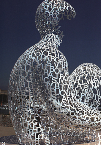 最后,让我们重新回到字与诗的主题。威廉杰菲WilliamJeffert曾经说过“文字是知觉的理解”,在这里或许不是十分确切,但我们确实直觉地从形式和观念中感受到什么,这得自于我们熟悉的词汇,使我们毫不迟疑地认为此即是艺术家所指,但远不是如此,他概念上的架构是通过我们通常的理解常识传达的,而艺术上采用了独一无二的艺术语言。物质自成体系,语句是思想的载体,而字母是先决条件。如果有什么能够接近其创作的中心思想,那就是哲学上物质意涵、意符、符号的双重性,依据艺术家自身的形而上学,这种“精神”是唯一的,同时是独特的,是形体内在由无生向生命的迸发。现代主义总是要被更新的理念所撼动。而Plensa正是利用了对于“撼动”本身的理解,巧妙地利用朴素的一成不变的字母,运用形式和观念的合成,让我们重新理解那些我们曾经并且一直感受的东西。